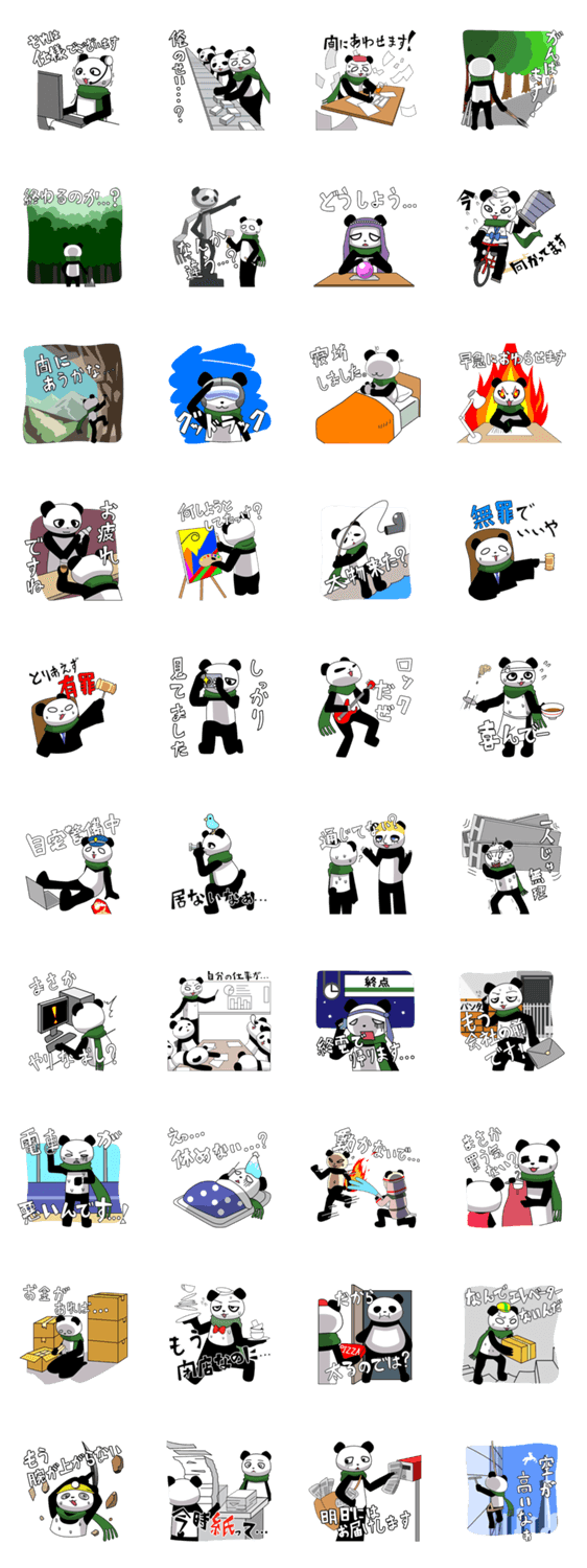 マフラーがトレードマーク!色んな職業のパンダが四苦八苦、やる気から回りのパンダがスタンプに登場!