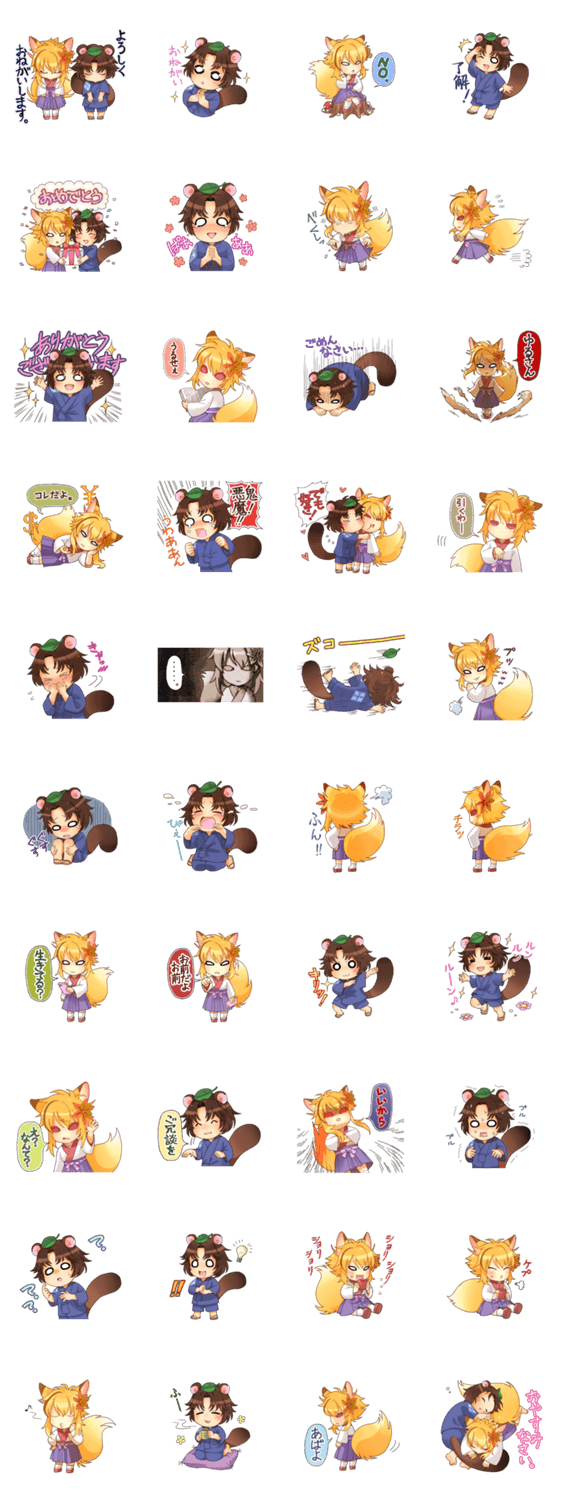 きつめのきつねちゃん、ふぬけのたぬきくんのスタンプです。かわいい顔してわがままキツネと、おだやかユルい草食系タヌキ。二人はとっても仲良しです。