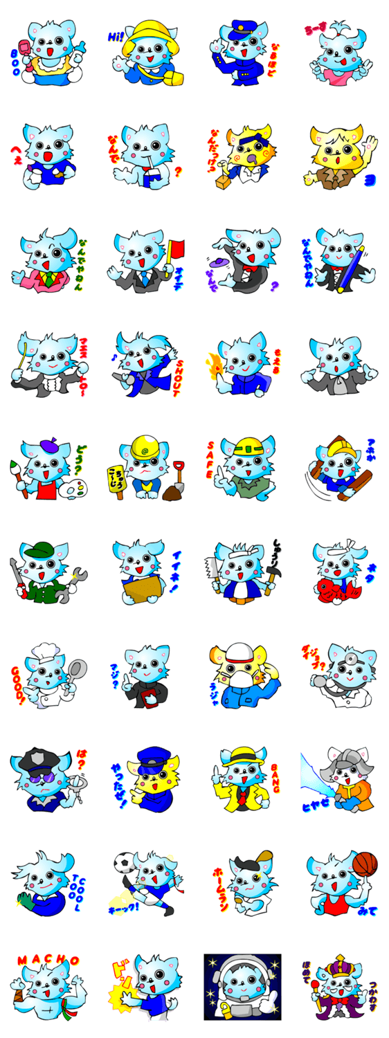 感情豊かな無表情犬チワワちゃんのカラフルなスタンプ。男性の職業のいろいろなシーンで使えるイラスト、会話やスポーツやツッコミなどいろいろパック。