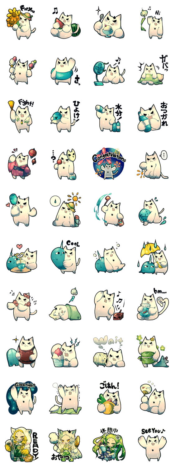 猫耳ゴーレム達の夏を楽しむスタンプです。ゴーレムの夫であるユニコーン(青くてツノがある生物)他、仲間やゴーレムの人型もちょこっと参加しています。