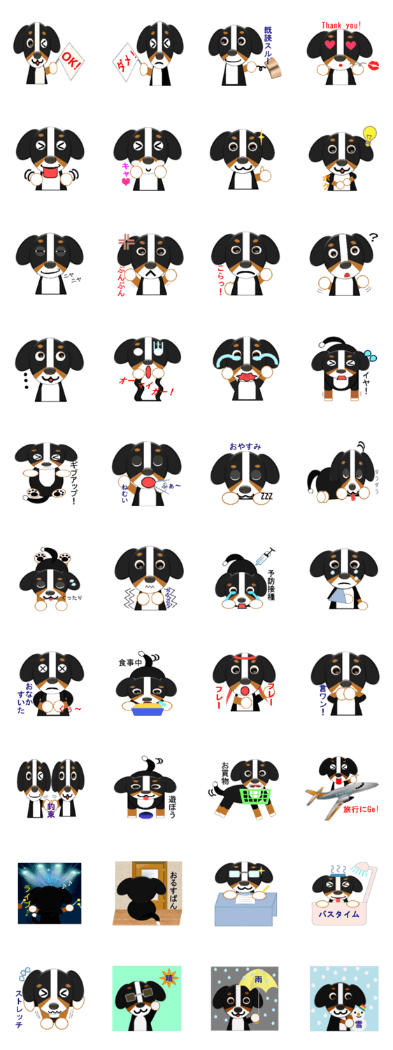バーニーズ・マウンテン・ドッグのようなまゆ毛のある犬・"まろいぬ"をモチーフにしたスタンプ。表情豊かな"まろいぬ"が日常会話を彩ります。