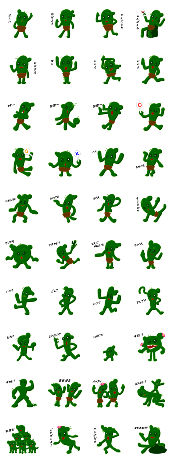 謎のうざいサボテンキャラのスタンプ。ツッコミ、挨拶し、一発返信する、さらに汎用的でよく使うシチュエーションのメッセージやイラストも同梱ダヨ。
