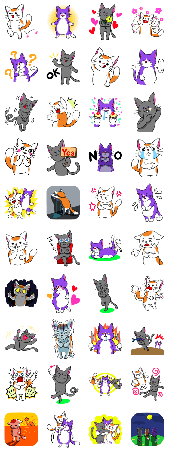 小太郎(白+茶色)、ぽよ(紫+白)、レオ(グレー)、仲良し猫さん達のスタンプです。