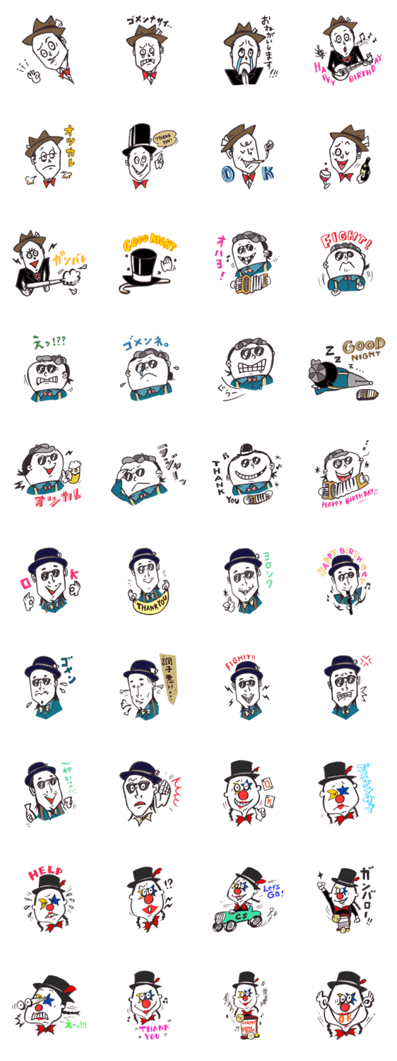 オオサカ育ちのガラクタ・サーカス・パーティー・ロックンロールバンド『ロックンタスケロール&ザ・キャプテンスウィング』のメンバーをキャラクター化したスタンプ。