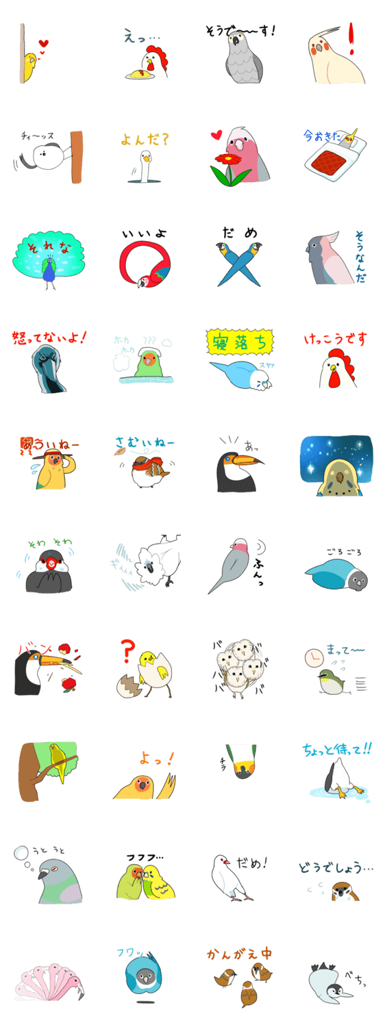 インコや文鳥、野鳥などさまざまな鳥のスタンプを揃えました。ユルい気分の時にどうぞ!