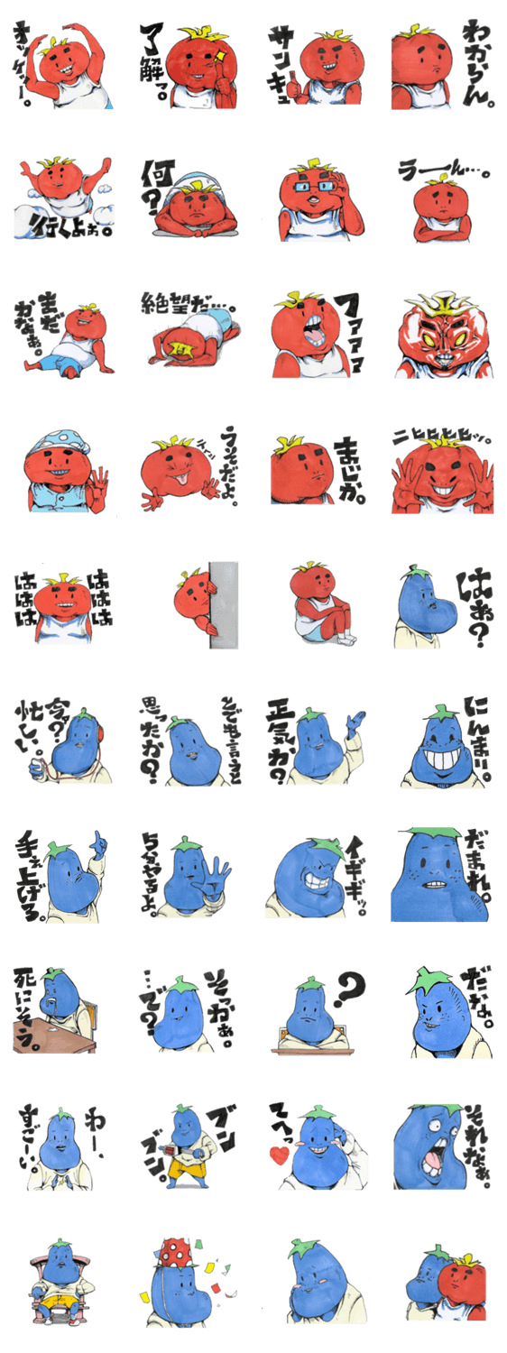トマト君とナス君の二人組のスタンプをアナログで作ってみました。もしも気になったら、使って可愛がってあげてください。