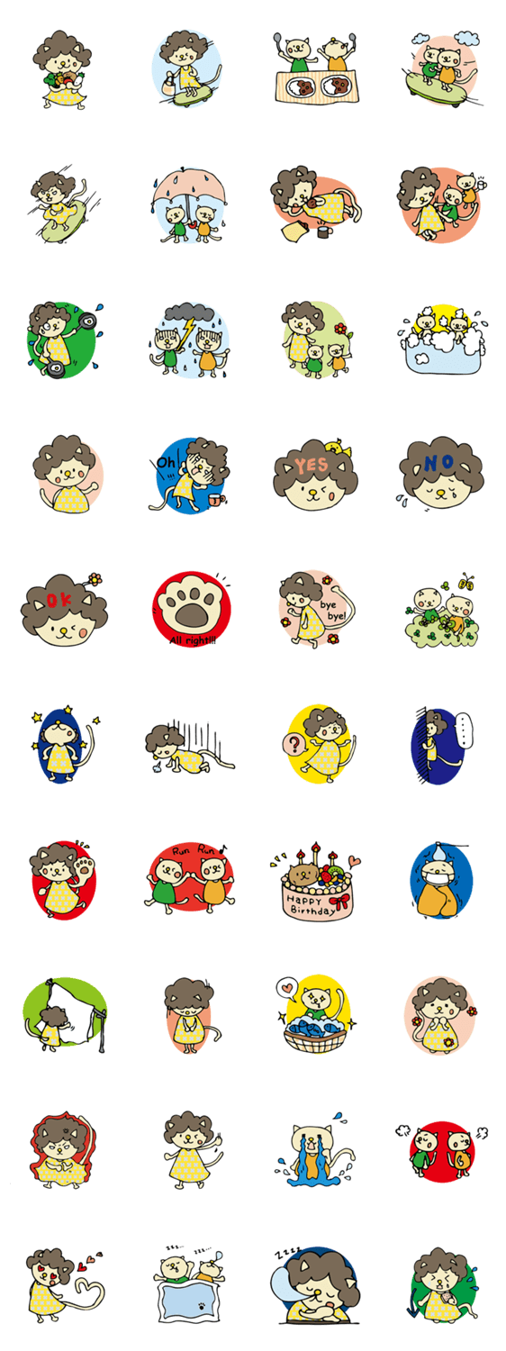 アフロなねこままは、家事に育児に毎日大忙し!でも、かわいい子供たちと楽しく暮らしてます!ママが使えるスタンプがいっぱい!家族、友達とじゃんじゃん使ってください!