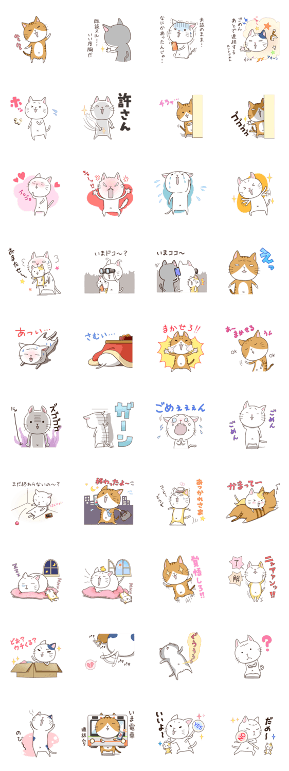 表情がころころ変わるにゃんこのスタンプです。毎日のトークの「ここぞ!」というところをにゃんこ達がすこ~しゆるく盛り上げます。作者のオススメは「いま電車」