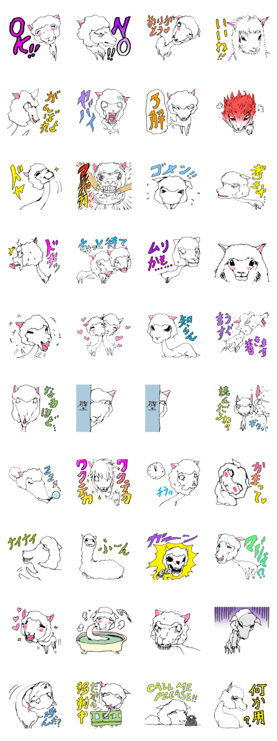 毛を刈られたアルパカの表情豊かでシュールなスタンプです
