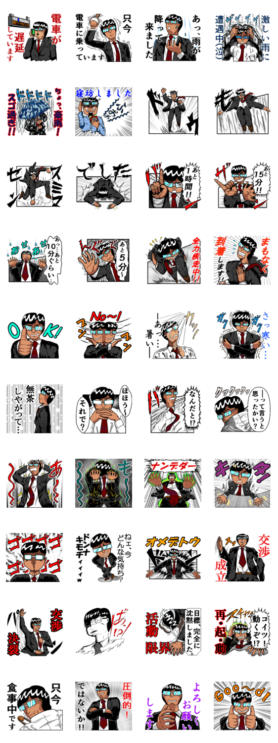 赤いネクタイなびかせて、ちょっとウザ男がダイナミックに感情表現します。基本おふざけ、たまにマジメなスタンプです。